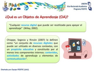 El documento define los objetos de aprendizaje como recursos digitales reutilizables con un propósito educativo. Explica que los objetos de aprendizaje deben ser flexibles, compartibles, actualizables y accesibles. También describe las características, tipos, ventajas y pasos para construir objetos de aprendizaje efectivos.