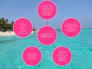 El documento habla sobre objetos de aprendizaje, que son recursos digitales modulares, flexibles, portátiles e interoperables que pueden ayudar al aprendizaje individual. Estos objetos de aprendizaje buscan optimizar los recursos obtenidos en su producción mediante su reutilización y favorecer el acceso a contenidos educativos.