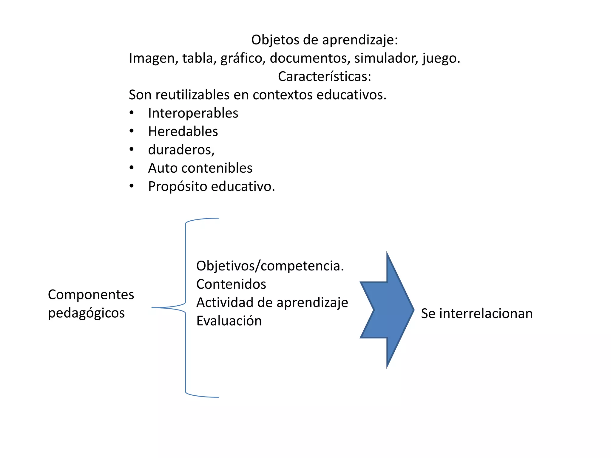 Los objetos de aprendizaje son recursos digitales como imágenes, tablas, gráficos y documentos que son reutilizables, interoperables, heredables, duraderos y auto contenibles con un propósito educativo. Los objetos de aprendizaje atomizan el aprendizaje, favorecen el proceso de enseñanza y aprendizaje, permiten reutilizar el conocimiento y compartirlo y difundirlo.