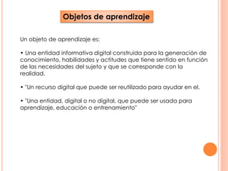 Un objeto de aprendizaje es una entidad digital creada para generar conocimiento, habilidades y actitudes. Puede encontrarse en formatos como imágenes, cuestionarios, diagramas, diapositivas y videos. Los objetos de aprendizaje ofrecen flexibilidad, facilidad de administración del contenido y adaptabilidad, además de eliminar problemas de incompatibilidad entre plataformas.