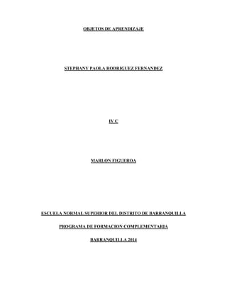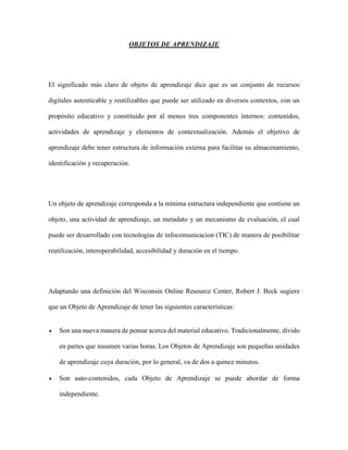 Los objetos de aprendizaje son recursos digitales reutilizables que contienen al menos tres componentes: contenido, actividades de aprendizaje y elementos de contextualización. Son pequeñas unidades de aprendizaje de 2 a 15 minutos que se pueden usar de forma independiente y en múltiples contextos. Los objetos de aprendizaje se pueden agrupar para formar secuencias de aprendizaje y están etiquetados con metadatos para facilitar su localización.