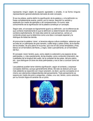 El documento describe la naturaleza de los conceptos y objetos del pensamiento. Explica que los conceptos son abstractos y nos permiten pensar en grupos de objetos usando una sola palabra. Los conceptos derivan su significado de las palabras de un lenguaje y nos permiten acceder a parte del mundo objetivo. Al pensar en objetos, lo hacemos a través de conceptos en lugar de percepciones sensoriales.