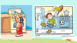 El documento habla sobre cuidados para prevenir accidentes en casa con niños pequeños. Recomienda no subirse a sillas o escaleras para evitar caídas y lesiones.