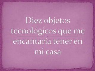 El documento describe varios artículos inteligentes deseados, incluyendo un celular sumergible con comandos de voz, un baño inteligente con bañera térmica y cama de bronceado controlados por voz, y una cocina portátil controlada por voz que pueda preparar comida. También menciona deseos de un dispositivo digital de agua de gama alta y artículos que sean a prueba de golpes y con reconocimiento de huellas dactilares.