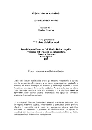 Este documento describe los objetos virtuales de aprendizaje, los cuales son recursos digitales desarrollados para apoyar actividades académicas. El Ministerio de Educación Nacional define un objeto de aprendizaje como un conjunto de recursos digitales con un propósito educativo y que incluye contenido, actividades de aprendizaje y elementos de contextualización. Los objetos de aprendizaje pueden utilizarse como recursos didácticos en cursos en línea o para flexibilizar el plan de estudios y facilitar la gestión del conocimiento. Gracias a la