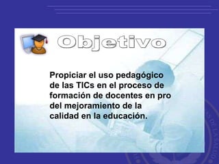 El documento trata sobre el uso de objetos virtuales de aprendizaje estandarizados según SCORM 1.2 para mejorar la calidad en la educación mediante el uso de TIC. Define los objetos de aprendizaje como recursos digitales autocontenibles que incluyen contenidos, actividades y metadatos para facilitar su identificación y recuperación. Además, describe la filosofía de SCORM que promueve la accesibilidad, personalización, interoperabilidad y flexibilidad en la enseñanza a través de diferentes plataformas.