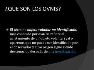 El término objeto volador no identificado (ovni) se refiere a cualquier objeto volador no identificado por el observador, a menudo relacionado con naves extraterrestres. Los extraterrestres se definen como seres vivos de origen cósmico y se les asocia comúnmente con avistamientos de ovnis, destacando tres tipos típicos: los grises, los nórdicos y los reptilianos, cada uno con características físicas distintas. La percepción de estos seres varía, pero frecuentemente se les atribuyen habilidades avanzadas e inteligencia superior.