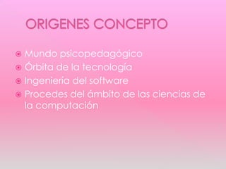 El documento define los objetos de aprendizaje como archivos digitales diseñados para ser utilizados en contextos educativos de forma interactiva y reutilizable. Los objetos de aprendizaje pueden incluir imágenes, simulaciones, ejercicios, diapositivas y más. Son clasificados por repositorios y pueden ser actualizados, combinados y referenciados para su reutilización. Los repositorios siguen estándares para permitir el intercambio entre plataformas.
