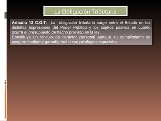 La obligación tributaria surge cuando se verifica el hecho imponible. Es un vínculo de carácter personal entre el estado y los sujetos pasivos (personas naturales y jurídicas). El hecho imponible es el presupuesto establecido por la ley que origina el nacimiento de la obligación tributaria y define la materia, base e imponible del tributo.