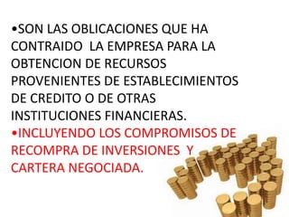 Este documento describe diferentes tipos de obligaciones y deudas que puede tener una entidad económica con terceros. Incluye obligaciones contraídas con establecimientos de crédito e instituciones financieras para obtener recursos, así como compromisos de recompra de inversiones y cartera negociada. También cubre obligaciones en moneda nacional o extranjera con entidades locales o del exterior.