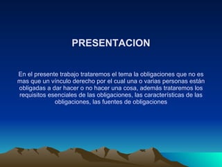 Este documento trata sobre las obligaciones en el derecho. Define una obligación como un vínculo jurídico donde una persona está obligada a dar, hacer o no hacer algo para otra persona. Explica los elementos de una obligación como los sujetos (deudor y acreedor), la relación jurídica y la prestación. También cubre las fuentes de las obligaciones como la voluntad y la ley, y los principios del derecho de obligaciones como la justicia y la buena fe. Concluye resaltando la importancia de comprender la teoría de las obligaciones para los estud