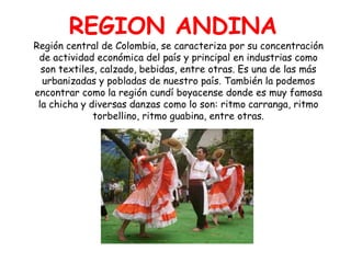 El documento describe brevemente las diferentes regiones de Colombia. La Región Andina se caracteriza por su concentración de industrias como textiles y calzado. La Región Orinoquia tiene población mestiza con influencia venezolana y se destaca por la ganadería. La Región Amazónas es rica en biodiversidad y hogar de pequeños grupos indígenas. La Región Pacífica alberga una gran riqueza ecológica y es cuna de la cultura afrocolombiana. La Región Caribe se compone de tierras y mares del