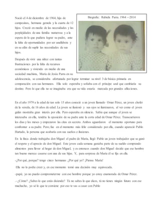 Este documento presenta la biografía de María de Jesús Parra. Narra cómo María creció en una familia numerosa de bajos recursos y solo pudo completar la educación primaria. A los 15 años se enamoró de Omar Pérez, pero su padre la obligó a casarse con Pablo Hurtado. El matrimonio resultó ser abusivo y violento, por lo que María regresó con sus padres embarazada. Años más tarde, se casó de nuevo pero enviudó cuando su esposo fue secuestrado. María crio sola a sus hijos