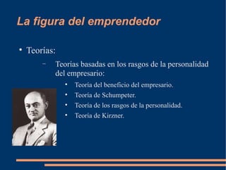 El documento resume la evolución histórica de la figura del emprendedor desde la antigüedad hasta la edad contemporánea y analiza diferentes teorías sobre el emprendedor, incluyendo teorías basadas en rasgos de personalidad y enfoques socioculturales. También describe cualidades clave de los emprendedores como flexibilidad, capacidad para asumir riesgos, habilidades de comunicación y liderazgo.