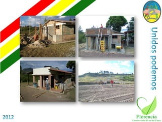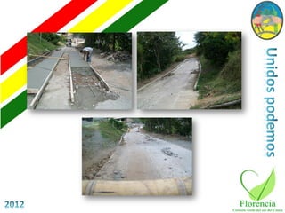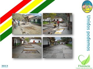 El documento detalla diversas obras y proyectos de infraestructura en Florencia, Cauca, incluyendo mantenimiento y construcción de vías, aulas, acueductos, y espacios culturales y deportivos. También se mencionan proyectos pendientes, como la pavimentación de calles y la mejora de servicios sanitarios, así como iniciativas aprobadas para dotar a escuelas y mejorar la agricultura en la región. En total, se destacan esfuerzos significativos en la optimización de servicios públicos y el desarrollo social y educativo del municipio.