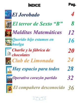 Este documento presenta resúmenes de varios libros para niños y jóvenes. Incluye información sobre sus autores como Jordi Sierra i Fabra, autor de "Querido hijo estamos en huelga", un libro sobre un niño cuyos padres se declaran en huelga debido a su mal comportamiento. También resume "El terror de sexto B" de Yolanda Reyes, sobre un bromista en la escuela, y "Malditas matemáticas" de Carlo Frabetti, en el que una niña cambia su percepción de las matemá