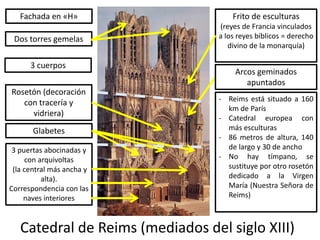 La Catedral de Reims, construida en el siglo XIII, es una obra maestra del arte gótico, famosa por su fachada en 'H' y su monumentalidad. También destaca la Sainte-Chapelle de París, diseñada para albergar reliquias cristianas, caracterizada por sus magníficas vidrieras. La Catedral de León, de estilo gótico radiante, refleja el gusto francés en España, y la Catedral de Barcelona, con su estilo gótico levantino, muestra la evolución arquitectónica en la región.