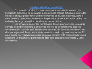 El documento describe diferentes métodos para la captación de agua, incluyendo la captación de agua de ríos, lagos y agua subterránea. Describe estructuras como pozos, cisternas y sistemas de bombeo que se pueden usar para captar agua de estas fuentes. También explica factores como la profundidad, velocidad de flujo y calidad del agua que deben considerarse al seleccionar un método de captación.
