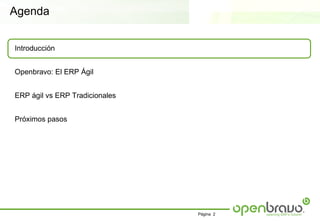 Este documento presenta Openbravo, un ERP ágil y de código abierto para pequeñas y medianas empresas. Explica las ventajas de Openbravo frente a ERP tradicionales, como menor coste de implementación, mayor flexibilidad y agilidad. También describe las características y funcionalidades clave de Openbravo para industrias como distribución, minoristas, fabricación y servicios.
