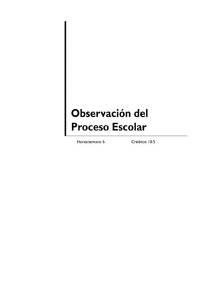 Este documento presenta el programa de un curso de observación del proceso escolar para futuros maestros. El curso tiene como objetivo que los estudiantes observen actividades de enseñanza y organización escolar para desarrollar habilidades docentes. El programa incluye tres bloques temáticos sobre los estudiantes, el trabajo del maestro y la organización escolar. Los estudiantes realizarán observaciones en escuelas secundarias para analizar estas temáticas y aplicar los conocimientos en otros cursos relacionados con la docencia.