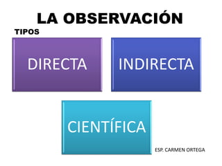 El documento describe los diferentes tipos de observación científica, incluyendo la observación directa e indirecta, y los tipos de observación descriptiva, inferencial y evaluativa. También explica las diferencias entre observación de laboratorio y de campo, controlada e intencional, y entre observación cuantitativa y cualitativa.