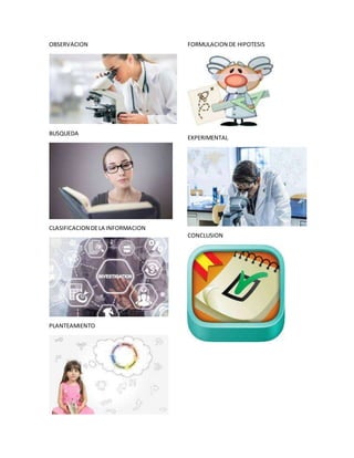 El documento describe las etapas del método científico: observación de un fenómeno, búsqueda de información, clasificación de datos, planteamiento de preguntas, formulación de hipótesis, experimentación para probar las hipótesis, y llegar a una conclusión.