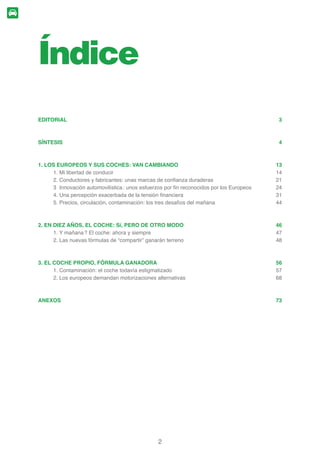 Este documento describe las opiniones cambiantes de los europeos sobre los automóviles. Actualmente valoran la libertad que proporcionan, pero en el futuro podrían verse más como un medio de transporte común. Aproximadamente tres cuartas partes de los europeos creen que los automóviles seguirán siendo igual de importantes en 10 años, aunque algunos esperan cambios. Compartir automóviles y alquilarlos por horas podrían volverse más comunes.
