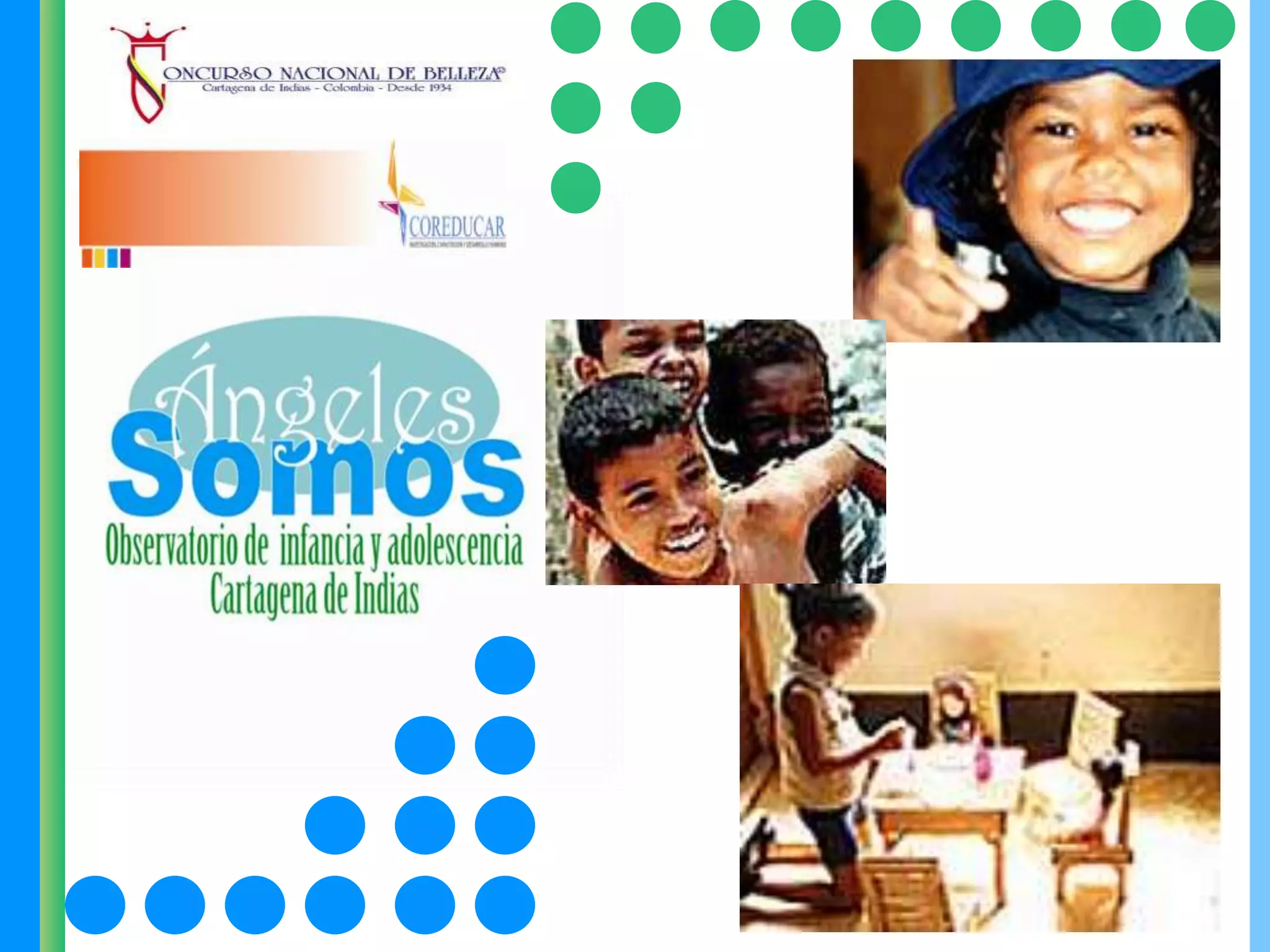 La Corporación Ángeles Somos es una entidad sin ánimo de lucro dedicada a garantizar los derechos de los niños, niñas y adolescentes en Cartagena de Indias. Fue creada en 2008 para investigar, divulgar información y formar en temas de infancia y adolescencia, con el objetivo de mejorar las políticas públicas y las condiciones de vida de los niños y adolescentes en la ciudad.