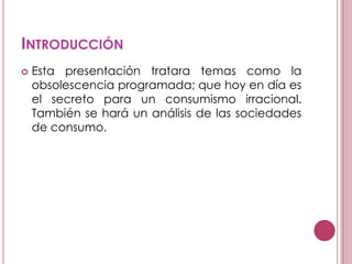 La presentación trata sobre la obsolescencia programada y las sociedades de consumo. Explica que la obsolescencia programada surgió con la producción masiva para mantener el consumo. Algunas empresas diseñan productos para fallar rápidamente y fomentar compras repetidas, en lugar de durabilidad. La publicidad juega un papel central para mantener el consumo constante a través de la insatisfacción y el deseo de lo nuevo.