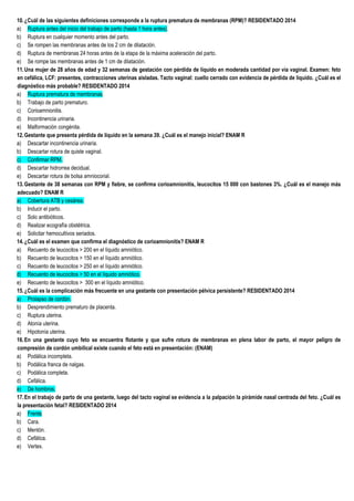 El documento contiene 38 preguntas sobre temas de obstetricia como maniobras de Leopold, presentaciones fetales, ruptura prematura de membranas, corioamnionitis, hemorragias del puerperio y clasificación de pelvis. Las preguntas abarcan desde identificar la maniobra de Leopold para determinar la presentación fetal, hasta el diagnóstico y manejo de complicaciones como RPM, corioamnionitis y hemorragias del puerperio. También incluye preguntas sobre diámetros fetales, mecanismos del trabajo de parto