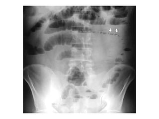 Este documento trata sobre la obstrucción intestinal, que ocurre cuando se detiene el movimiento del contenido a través del intestino. Describe las causas de la obstrucción, como cuerpos extraños, tumores, adherencias o volvulos. Explica la fisiopatología de la obstrucción, incluyendo la deshidratación, acidosis y choque. Finalmente, destaca los síntomas clave de dolor abdominal, distensión, náuseas y falta de emisiones, y los métodos de diagnóstico y tratamiento quirúrgico.