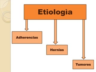 Las causas más comunes de obstrucción del intestino delgado incluyen adherencias postquirúrgicas, hernias y tumores. Los síntomas varían dependiendo de la ubicación de la obstrucción, pero incluyen dolor abdominal, vómitos y distensión. El diagnóstico se basa en la historia clínica, exploración física y estudios como radiografías, endoscopias y tomografías computarizadas. El tratamiento puede incluir medidas generales, cirugía u otros procedimientos para aliviar la obstrucción.