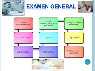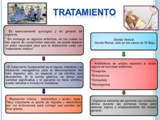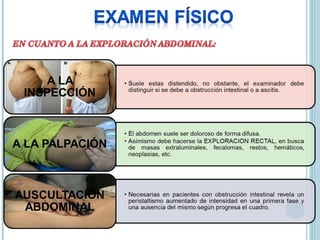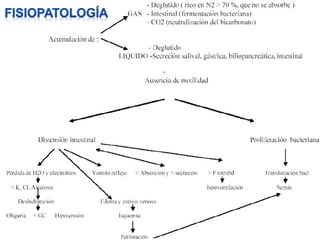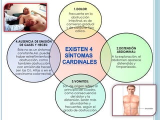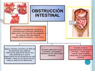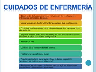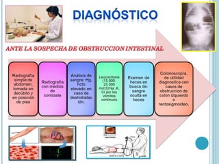 Este documento presenta la valoración de enfermería de una paciente adulta mayor hospitalizada con diagnóstico de obstrucción intestinal. La paciente refiere estreñimiento, dolor abdominal y vómitos. A la observación se encuentra débil con signos de deshidratación. El resumen diagnostica déficit de volumen de líquidos y perfusión tisular inefectiva a nivel gastrointestinal, proponiendo intervenciones como reposición de líquidos y tratamiento sintomático.