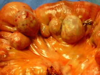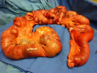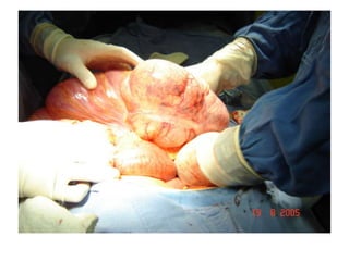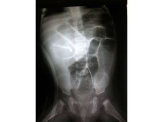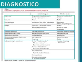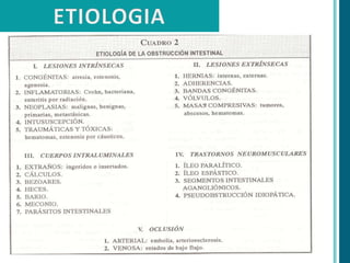 Este documento presenta información sobre la obstrucción intestinal. En primer lugar, define la obstrucción intestinal como una alteración parcial o completa de la progresión del contenido intestinal por oclusión de la luz. Luego, clasifica las obstrucciones intestinales en simples o estranguladas dependiendo de si existe o no compromiso de la vascularización del intestino. Por último, describe algunos signos y síntomas comunes de la obstrucción intestinal como dolor abdominal, distensión abdominal, vómitos y ausencia de emisión de gases y heces.