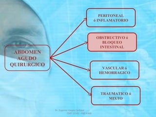 El documento proporciona información sobre la obstrucción intestinal aguda. Describe las causas, tipos, síntomas y tratamiento de la obstrucción intestinal. Además, brinda detalles sobre el historial y desarrollo del tratamiento quirúrgico de la obstrucción intestinal a lo largo del tiempo.