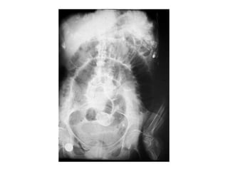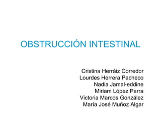 El documento describe la obstrucción intestinal, definiéndola como la detención completa y persistente del tránsito de las heces y los gases en un segmento del intestino. Explica las causas más frecuentes, la clasificación, fisiopatología, manifestaciones clínicas, exploración física y datos analíticos útiles para el diagnóstico de esta urgencia abdominal grave.