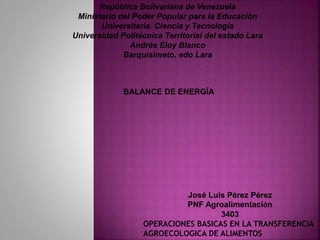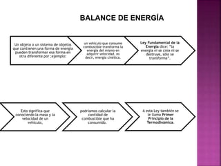 El documento habla sobre los principios del balance de energía. Explica que la energía no se crea ni se destruye, sólo se transforma de una forma a otra. Da ejemplos como un vehículo que transforma la energía química del combustible en energía cinética, o un objeto que al caer transforma su energía potencial en energía cinética. También explica la diferencia entre sistemas abiertos y cerrados, y que en sistemas cerrados la energía total se conserva de acuerdo a la primera ley de la termodinámica.