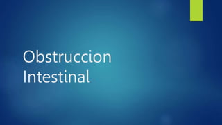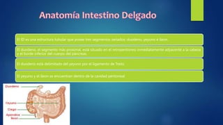 1) El documento describe la anatomía, fisiología y patologías del intestino delgado, incluyendo las causas más comunes de obstrucción intestinal.