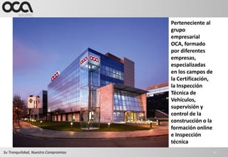 OCA SOCOTEC es una compañía de inspecciones y certificaciones técnicas con 27 delegaciones en España. Ofrece una variedad de servicios de control y asistencia técnica en sectores como la construcción, industria, medio ambiente e instalaciones. La compañía se basa en valores como la competencia, colaboración, objetividad y compromiso para proporcionar soluciones de calidad a sus clientes.