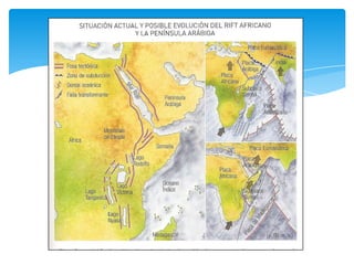 Este documento trata sobre la formación y evolución de los océanos. Explica que los océanos se originan cuando los continentes se separan debido al movimiento de las placas tectónicas, formando dorsales oceánicas donde sale magma del manto terrestre. También describe la historia del Mar Rojo y el Mar Mediterráneo, señalando que son ejemplos de océanos en proceso de formación. Finalmente, incluye información sobre puntos triples, zonas de subducción y otros fenómenos geológic