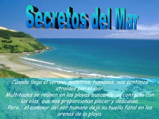 El documento habla sobre los daños que causa la basura plástica en los océanos y la fauna marina. Millones de bolsas y botellas de plástico son arrojados a las playas y mares cada año, donde las tortugas y delfines pueden confundirlos con alimento y ahogarse. Un estudio encontró gran cantidad de basura de plástico en el estómago de polluelos de alcatraz. El documento pide a las personas que recojan la basura en las playas y ayuden a proteger los océ
