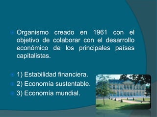 El documento describe la Organización para la Cooperación y el Desarrollo Económico (OCDE), una organización creada en 1961 para promover el desarrollo económico entre los principales países capitalistas. La OCDE trabaja en áreas como la estabilidad financiera, la economía sustentable y la economía mundial. Incluye una lista de países miembros y los objetivos y funciones de la organización.