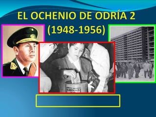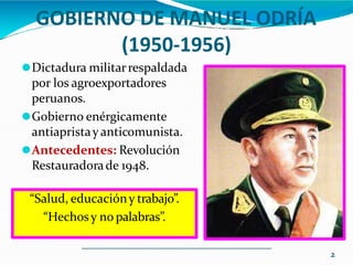 El gobierno de Manuel Odría entre 1950-1956 fue una dictadura militar respaldada por los agroexportadores. Aunque reprimió a los movimientos opositores, también amplió las políticas sociales e implementó reformas como el sufragio femenino. En 1955 se aprobó una ley que permitió a las mujeres mayores de 21 años o 18 años si estaban casadas el derecho a votar, siendo la primera vez que votaron en 1956 eligiendo las primeras diputadas y senadoras.