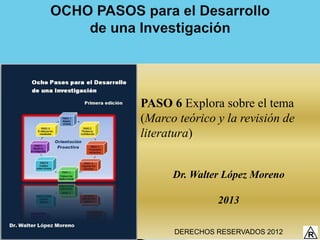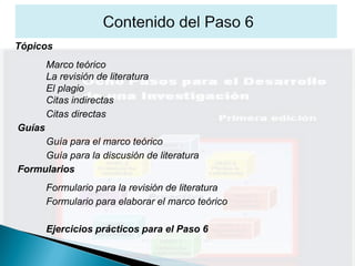 Este documento proporciona instrucciones sobre cómo explorar un tema a través de la revisión de literatura y el desarrollo de un marco teórico. Explica los conceptos clave como marco teórico, revisión de literatura y citas, e incluye formularios y ejemplos para ayudar al lector a comprender estos temas fundamentales para la investigación.