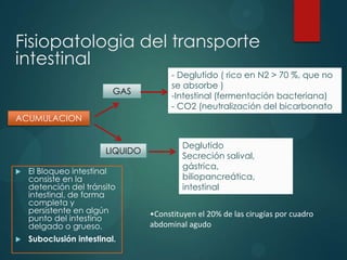 Bloqueo intestinal consiste en la detención del tránsito intestinal. Puede deberse a suboclusión u obstrucción. Los síntomas incluyen dolor abdominal, distensión y falta de emisión de gases y heces. La radiografía simple puede mostrar dilatación de asas intestinales. La tomografía computarizada y la enterografía son útiles para determinar la ubicación y causa de la obstrucción. El tratamiento involucra estabilización del paciente y cirugía si la obstrucción no se resuelve de forma conservadora.
