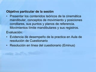 La cinemática de la oclusión estudia los movimientos de la mandíbula en relación al maxilar superior. Incluye cinco ejes de rotación y tres planos de movimiento. Los principales movimientos de la mandíbula son la apertura, el cierre, la lateralidad, la protrusión y la retrusión. Estos movimientos se registran usando técnicas como el gnatograma de Posselt, el arco gótico de Gysi y la gota de Glickman.