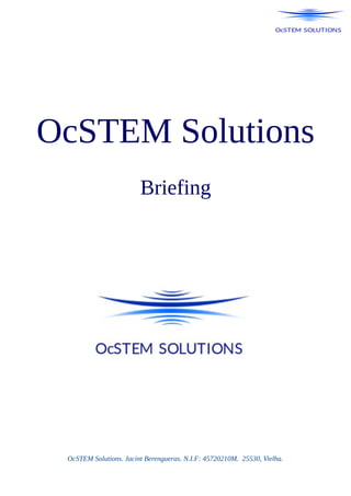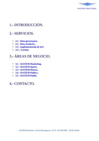 El documento presenta los servicios de OcSTEM Solutions, una empresa que ofrece soluciones de ciencia, tecnología, ingeniería y matemáticas. OcSTEM Solutions proporciona servicios como gobernanza de datos, análisis de datos, implementación de Internet de las Cosas y soluciones personalizadas. La empresa también trabaja en áreas como marketing, deportes, hostelería y política.