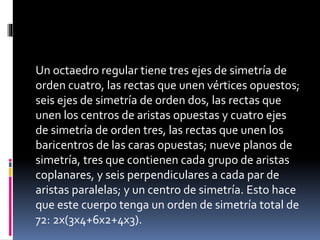 Un octaedro es un poliedro de ocho caras. Si sus ocho caras son triángulos equiláteros iguales, es un octaedro regular, que es uno de los sólidos platónicos. Un octaedro regular tiene simetría total de 72 y propiedades como que si se le corta con un plano a través de seis aristas, da como resultado un hexágono regular. En la naturaleza, se encuentran formas octaédricas en cristales como el diamante, la magnetita y la fluorita.