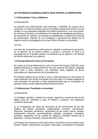 La Ley de Marcelo Quiroga Santa Cruz contra la Corrupción establece un Consejo Nacional contra la Corrupción independiente de los tres poderes del Estado para investigar, prevenir y sancionar actos de corrupción. Se crea una Oficina Técnica Nacional contra la Corrupción con recursos para investigar delitos como enriquecimiento ilícito, sobornos, tráfico de influencias y apropiación indebida de fondos públicos. Además, la ley promueve la transparencia en la gestión pública a través del libre acceso a la inform