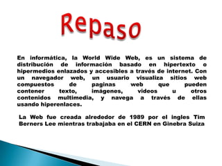 La World Wide Web es una colección de documentos electrónicos interconectados llamados páginas web que se almacenan en servidores de todo el mundo. Las páginas web contienen texto, imágenes y otros contenidos vinculados entre sí mediante hipervínculos que permiten navegar entre ellas. La Web fue creada por Tim Berners-Lee en 1989 y se ha convertido en un medio global para publicar y compartir información de forma electrónica.